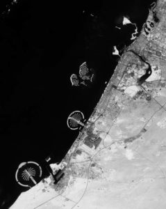 Figure 1. NASA released this 2008 picture taken from space that shows Dubai’s massive coastal project—Palm Islands— with groups of several artificial islands. The two Palm Islands are at the lower end, and the ongoing World Island is at the upper end. Each project will build thousands of villas and apartments.