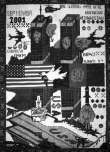 Figure 4. 9/11 War Carpet. Many small carpets depicting the Twin Towers being destroyed (simultaneously) became very popular among weavers after 2001, especially because so many American military personnel purchased them, wool, 3’10” x 2’10”, early twenty-first century.