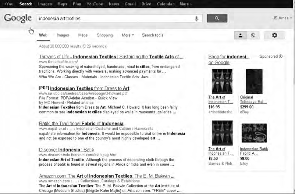 Search terms in Google Scholar can be similar to those used in basic Google. The results pages are different, however. Check Figures 3 (regular Google) and 4 (Google Scholar) to see the differences in the results pages for the identical search terms. The results for Google Scholar provide the article or book title; the author; the publication date; and if it is an article, the title of the journal. In addition, there are links to “Cited by” and “Related articles.” The “Cited by” link connects to other articles that have cited this book or article and are useful to find additional, similar resources. The number of citations also gives a notion of the popularity of the article. The “Related articles” link goes to other articles on the same topic. (Some people use “cited by” to check their own publications to see who has used their work and how it is being used.) In the left pane of Scholar results are date limiters and sorting options. There is an “Alert” link that notifies you when new articles on similar subjects are released.