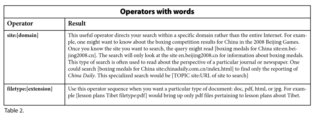 An operator is a symbol placed before one or more search terms. The function of an operator is to eliminate nonpertinent results and focus more directly on the information the user seeks. For example, when searching for a biography of Sun Yat-sen, an operator helps eliminate results pertaining to the sun. Searches normally look first for all words in a query and then look for each word individually. The further down on the list of results, the fewer the search terms found. So if you search for “A,B,C,D,E,” the first results may contain five of the terms; lower down, perhaps just four of the terms and then three of the terms were found. This is one reason that many searchers will only look at the first and second pages of the results and go no further. Type the following symbol operators directly into the search box or go to “Advanced search” under the gear symbol in the right corner of the screen, where operator choices are listed. See Table 1. There are also operators expressed with words instead of symbols. See Table 2.